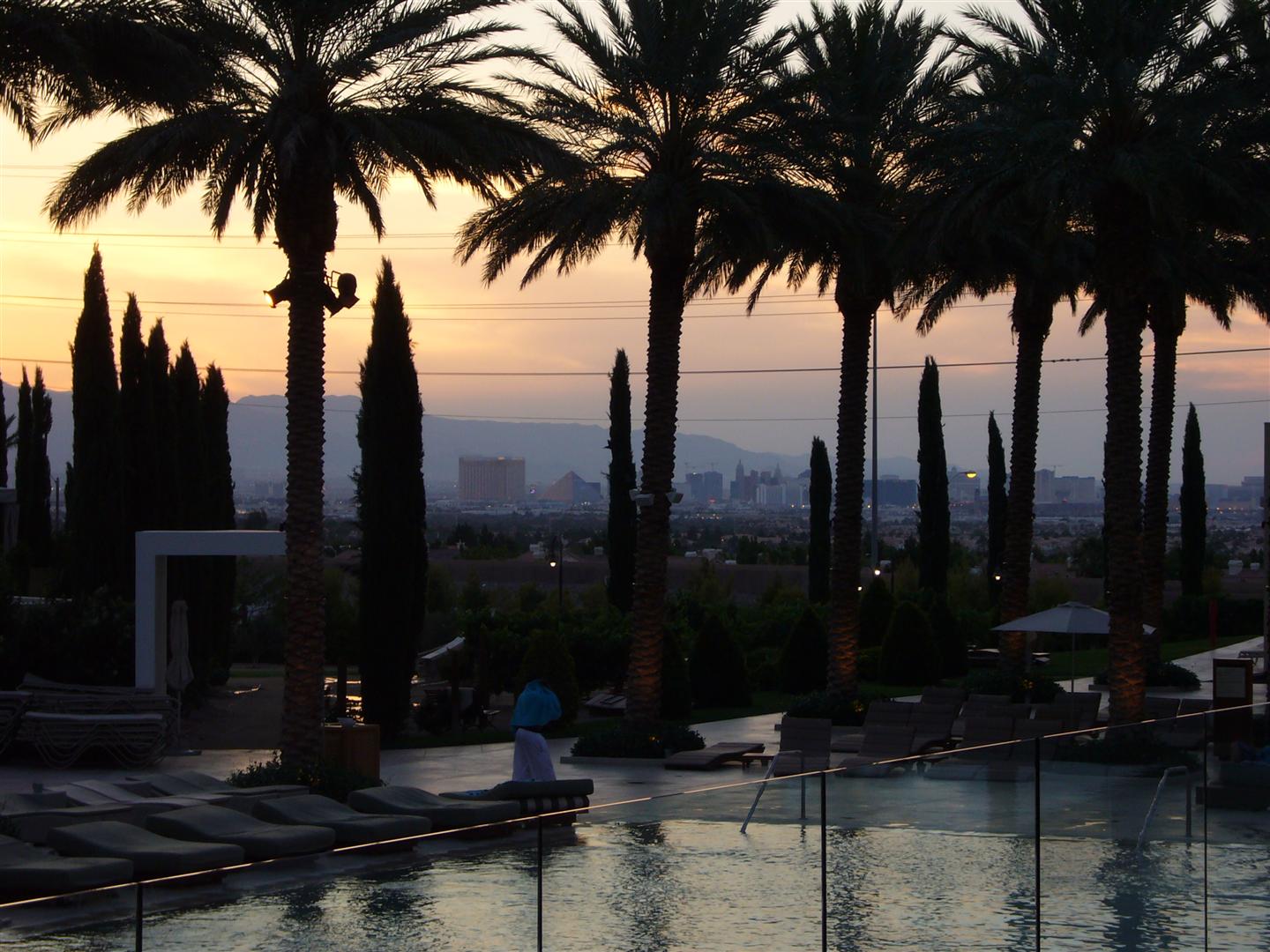 Het zwembad bij ons hotel met uitzicht op de strip.
