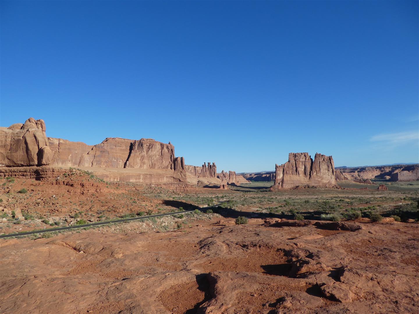 The paved road that crosses along the Arches National Park, ends 9 miles (14,5 km) north of Balanced Rock in the part that is known as the Devils Garden (above Landscape Arch and one of the trails).
