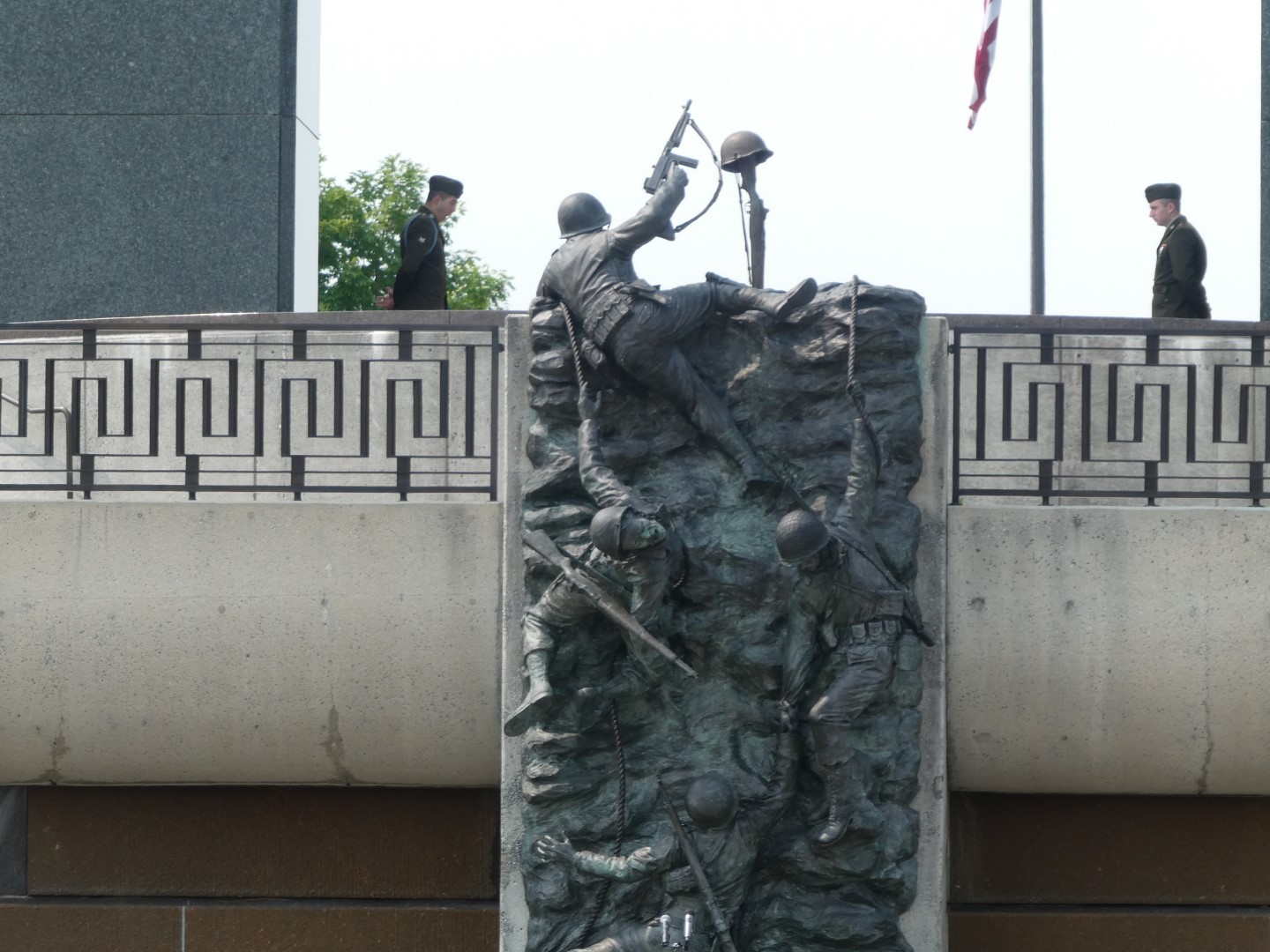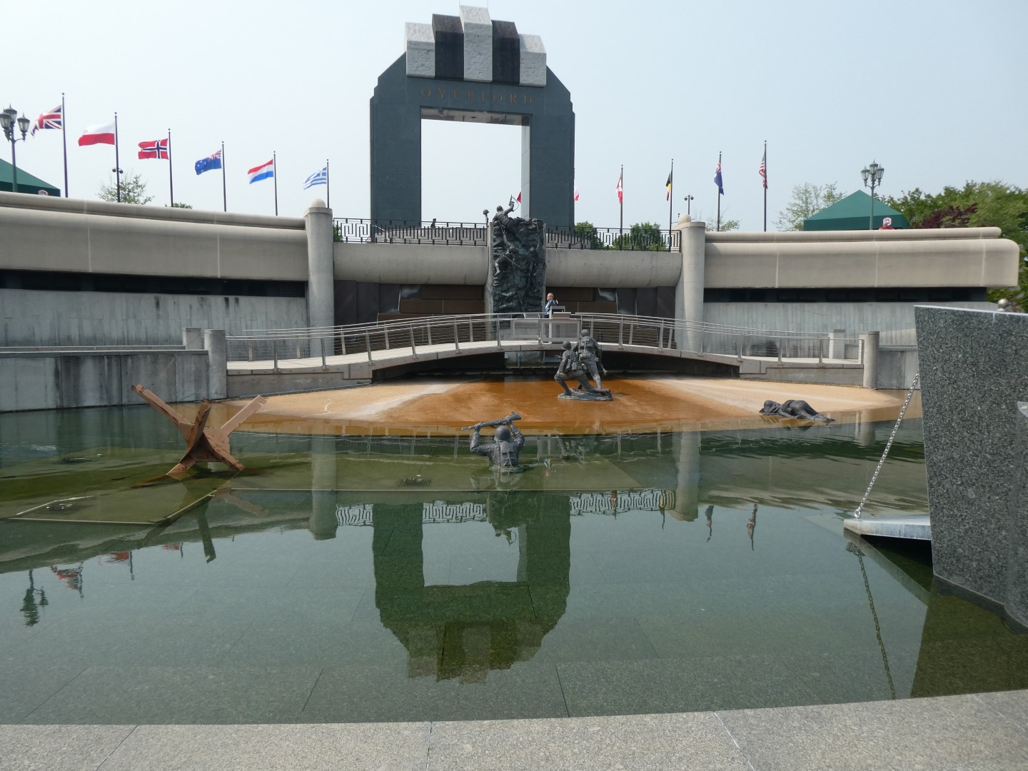 The second square, Gray Plaza, reflects the landing and combat phases of the invasion. It includes what is called the invasion pool with beach obstacles in the water, sculptures of soldiers struggling ashore and a display of the Higgins vessel used for the invasion. This section features intermittent jets of water spouting from the pool, and the images and sounds of sporadic gunfire.