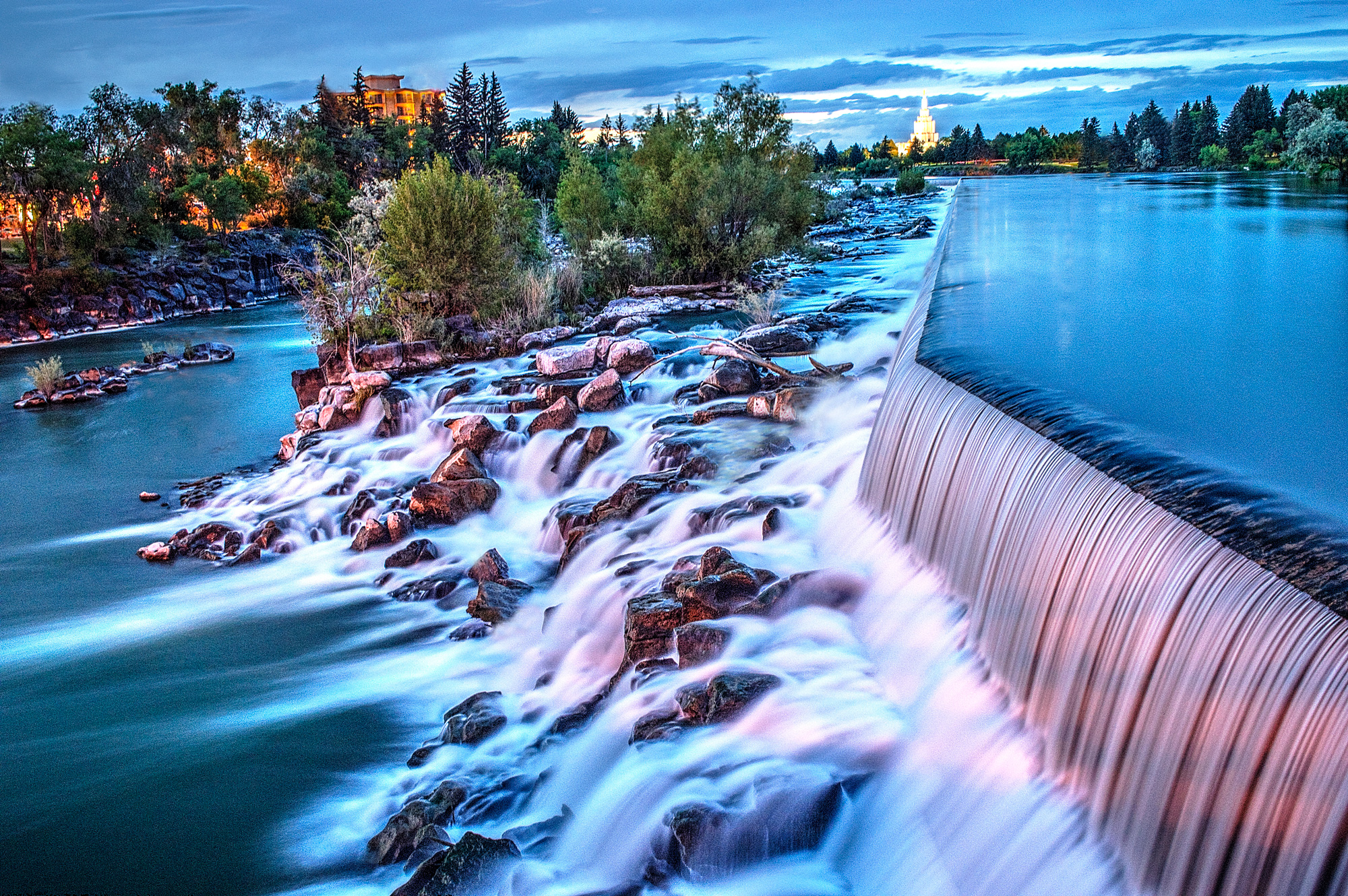 Although Idaho Falls, from which the city gets its name, has been dammed up, the waterfall still offers a picturesque sight in its park-like setting.