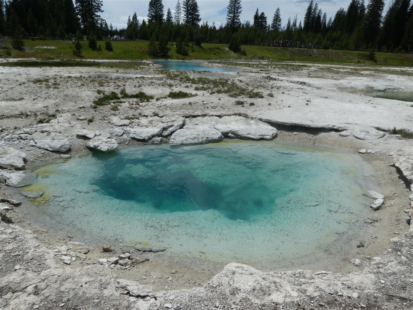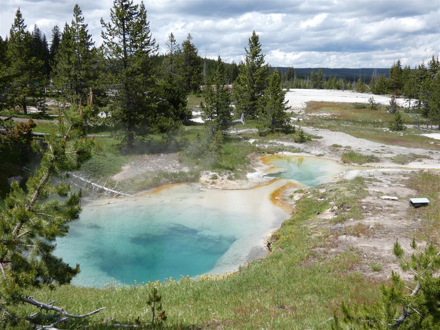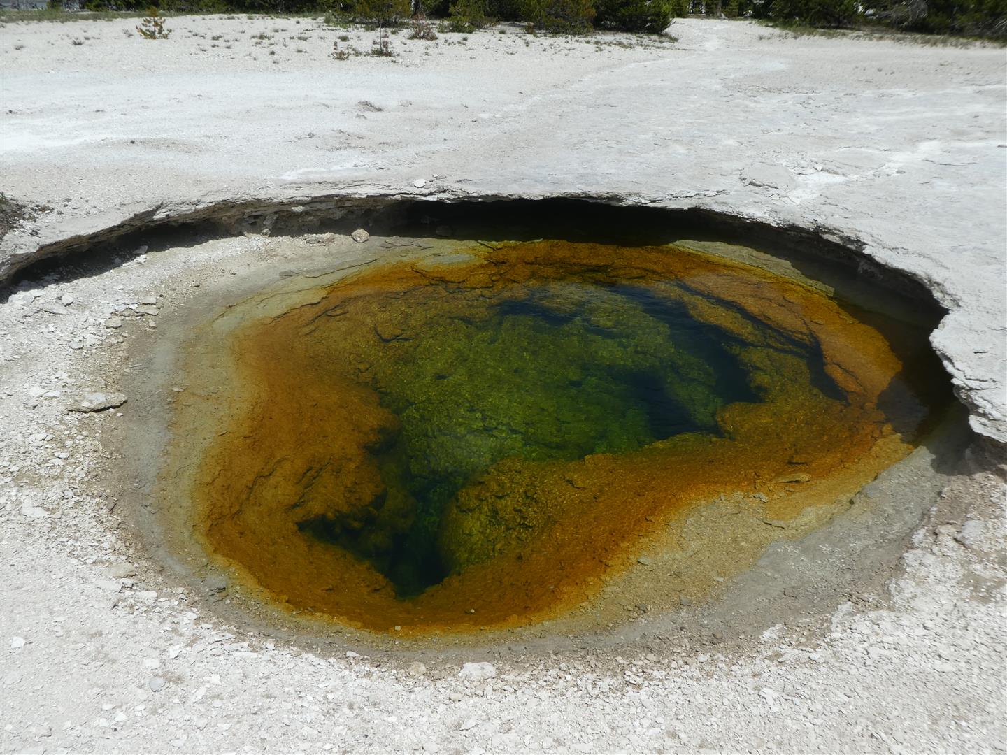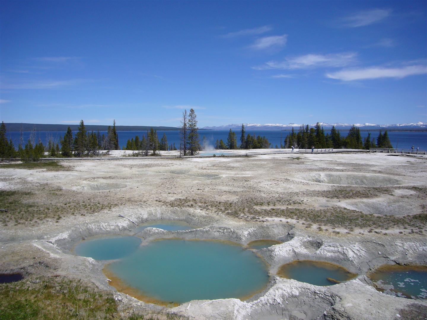 4) West Thumb Geyser Basin: Via een houten pad boven de grond loop je langs poelen met turkooisblauw water, enkele warmwaterbronnen en vooral enkele geisers die bijna in het meer liggen. De Black Pool is het meest indrukwekkend in de West Thumb Geyser Basin.
