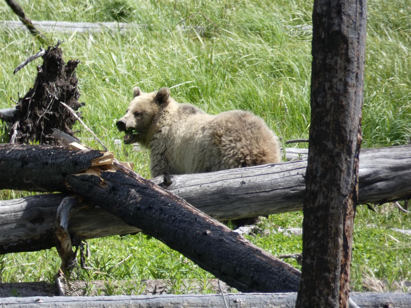 In Lamar Valley zag ik een prachtige jonge grizzlybeer, de ranger vertelde me dat de grizzlybeer de vorige dag een hert had gedood en opgegeten.