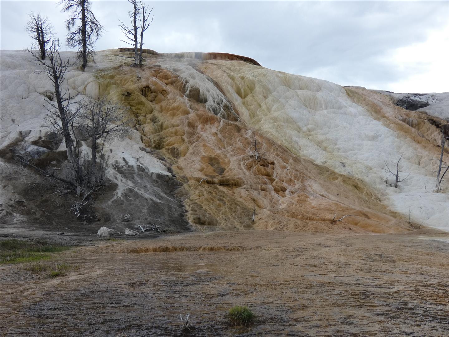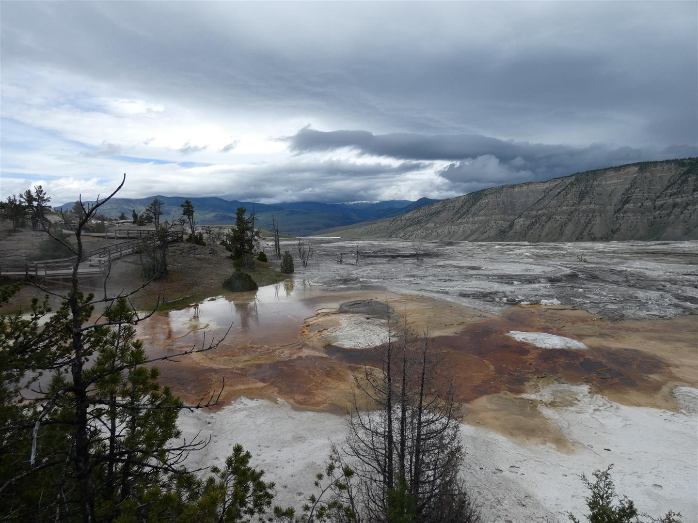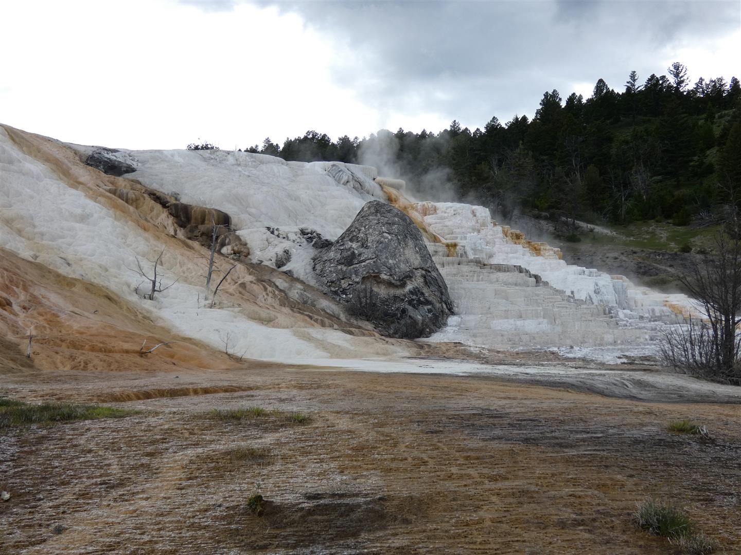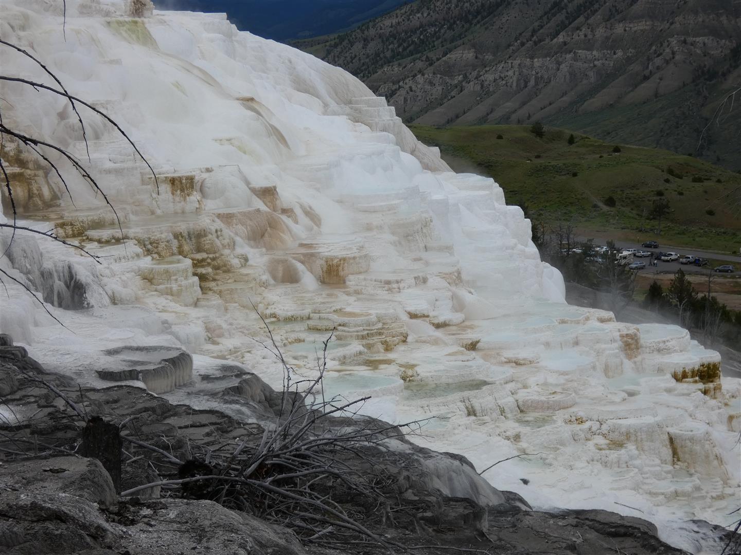 Mammoth Hot Springs wordt gekenmerkt door kleurrijke warm water poelen en sierlijke, terrasvormige kalksteenformaties.