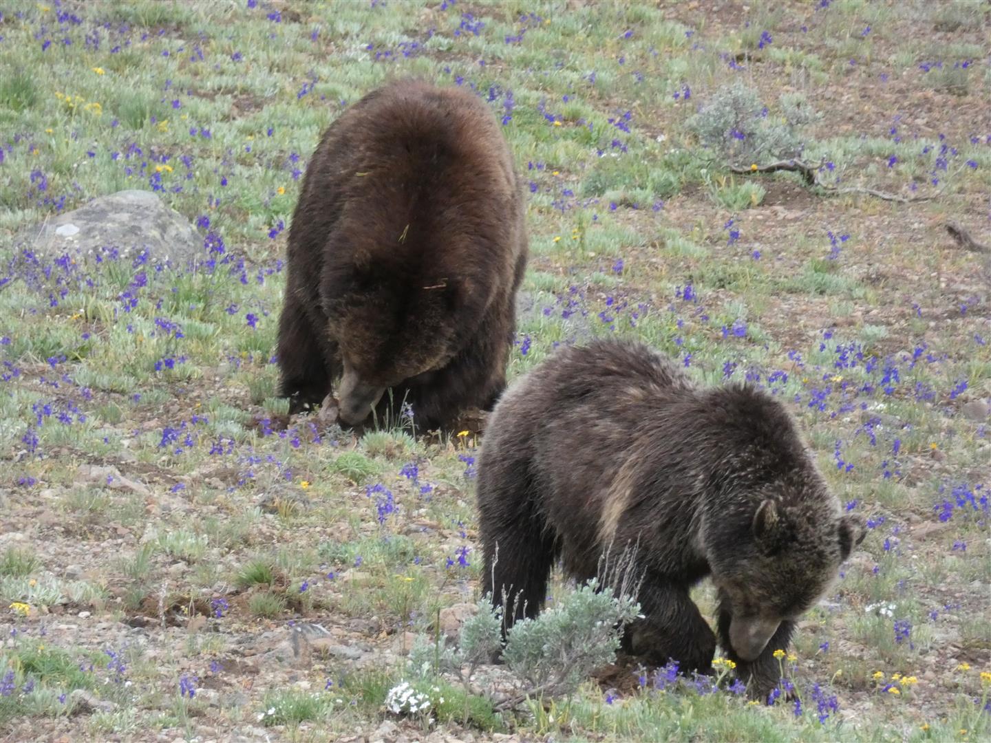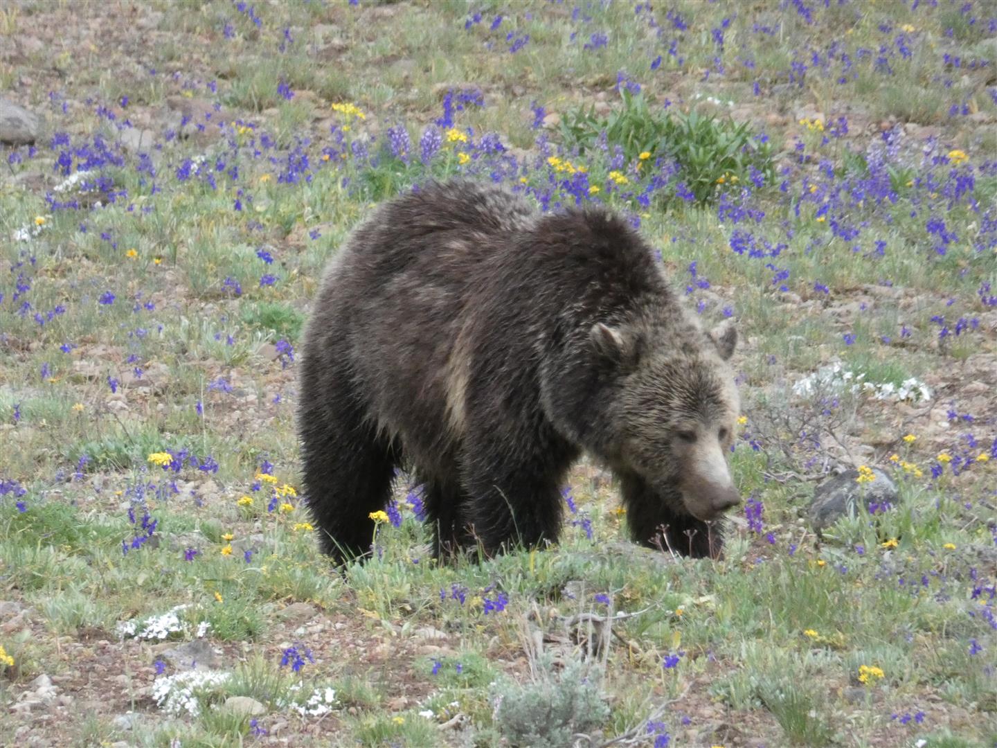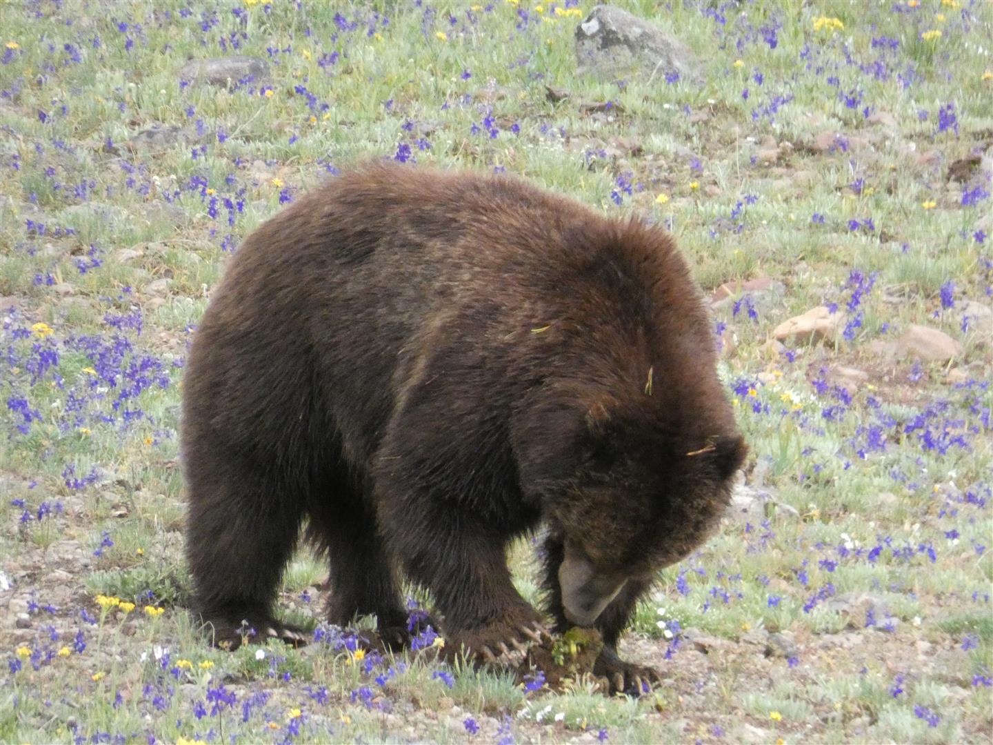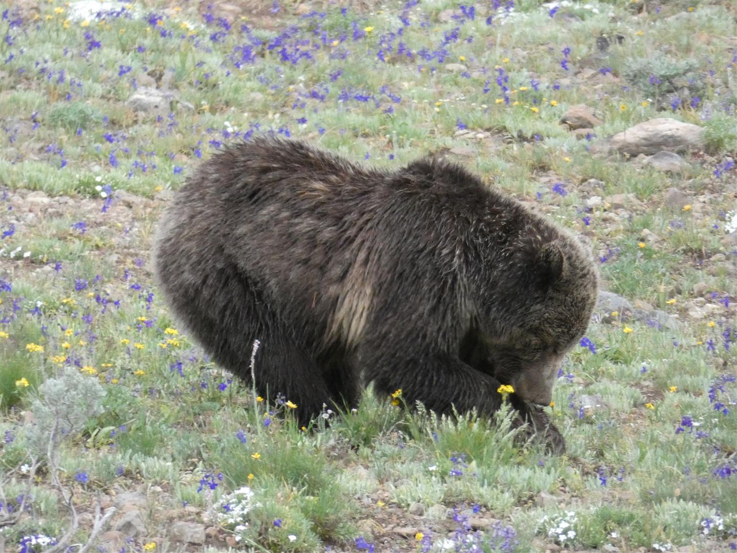 In Lamar Valley I saw a beautiful young grizzly bear, the ranger told me that the grizzly bear had killed and eaten a deer the previous day.